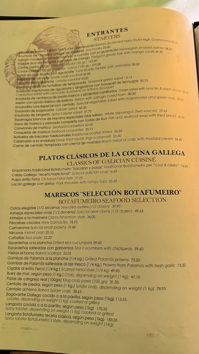 Botafumeiro offers a menu rooted in the rich traditions of Galician and Spanish seafood cuisine, presented with a refined yet approachable style. The selection is perfect for those seeking a memorable meal centered around fresh, high-quality ingredients, with dishes that invite sharing and savoring at a relaxed pace.